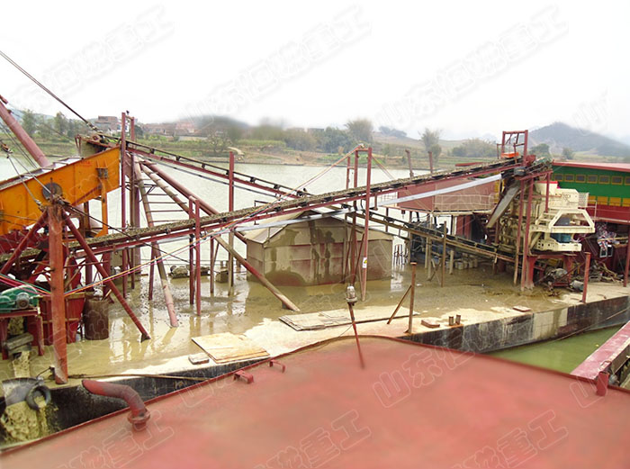 挖沙選鐵船由浮體、鏈斗挖沙系統、篩分系統、磁選系統、尾沙排除系統、動力系統組成。首先,河道里有水,我們的選礦設備必須要浮在水面上工作,因此我們用3.5-4毫米的鋼板做成了浮體,根據挖沙深度的不同,浮體的寬度和長度都有相應的尺寸要求,一般寬度在1.5-2米之間,長度在16-32米之間。另外,增加船的穩定性,兩個浮體之間間隔了一定的距離,一般為1.5米左右。顧名思義,這套選礦設備的上料系統是鏈斗式的挖沙系統,河沙由鏈斗提上來以后,因為有大小不一的石子,為了保護磁選機的安全,必須經過篩分系統。根據河道的環境不同,一般來說,石子比較少、直徑比較小的河道用自震式比較好,維修方便,節省動力(約5KW)。